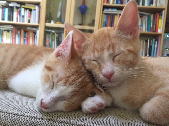 P.S. The featured photo is that of my two cats, Leo and Kasper, twin brothers, who love to snuggle and purr, and who are serious about their sleeping.